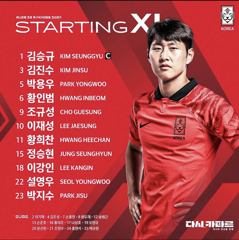오늘 경기는 4-2-3-1 포매이션으로 경기에 임하였는데, 최전방에는 조규성, 공격 2선의 중앙에는 이재성이 배치됐고, 이강인과 황희찬이 측면 공격을 맡았었습니다. 중원에는 황인범과 방용우, 그리고 센터백 듀오인 김민재, 김영권을 대신하여 박지수, 정승현이 맡아서 뛰었습니다. 풀백에는 김진수, 설영우, 그리고 마지막으로 우리나라의 골대는 주장 김승규가 지켰습니다.