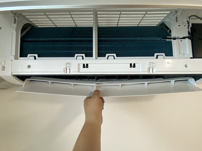 벽걸이 에어컨의 윗 뚜껑을 열어주면 간단하게 제거할 수 있는 필터가 보입니다. 이 필터는 제거하여 간단하게 흐르는 물에서 세척하여 주세요. 오염도가 심할 경우 중성세제와 칫솔을 이용하여주세요. 그리고 이것은 선택적인 작업인데, 저의 경우 밑에 날개를 제거하여 별도로 세척해 주었습니다. 이 날개는 모델마다 다르겠지만, 가운데 지지대를 제거한 뒤 살짝 구부러지게 하여 양 끝을 한쪽식 빼주면 됩니다. 부러지지 않도록 주의해 주세요.