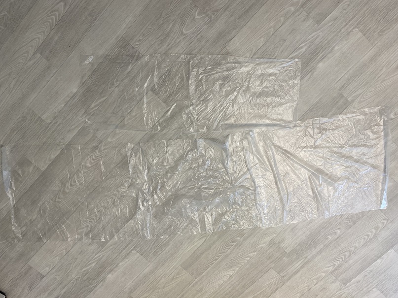 우선 준비물은 첫번째, 다이소에서 판매하는 다이소 에어컨 세정제를 구매하셔야 합니다. 종류는 두 가지인데 저는 그나마 이름을 들어봤던 산도깨비로 선택했습니다. 두 번째 준비물은, 세척 할 때 세척액이 튀는 것을 방지하기 위한 비닐입니다. 비닐의 경우 김장비닐 같은 큰 비닐을 사용해도 되지만 저는 집에 있는 위생봉투를 위의 사진과 같이 잘라 연결하여 사용했습니다.