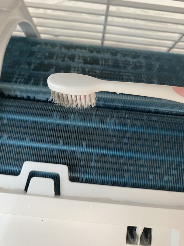 냉각핀에 뿌릴 때 주의사항으로는 냉각핀의 방향에 맞추어 뿌려주어야 세정액이 많이 튀지 않습니다. 저의 경우 냉각핀의 방향이 세로로 되어 있어서 세로로 뿌려주었습니다. 뿌려준 뒤 먼지가 많을 경우에는 준비한 칫솔로 살살 문질러 주세요. 이때도 냉각핀이 쉽게 휘어질 수 있어 냉각핀의 방향에 맞추어 문질러야 합니다.